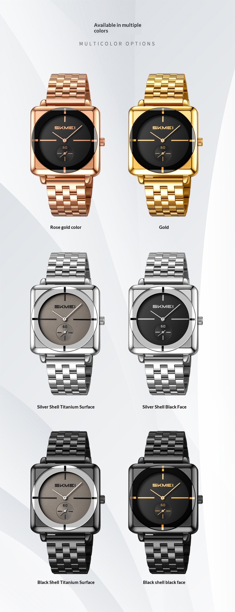 Colors: Rose gold; gold case with titanium dial; silver case with black dial; black case with titanium dial; black case with black dial